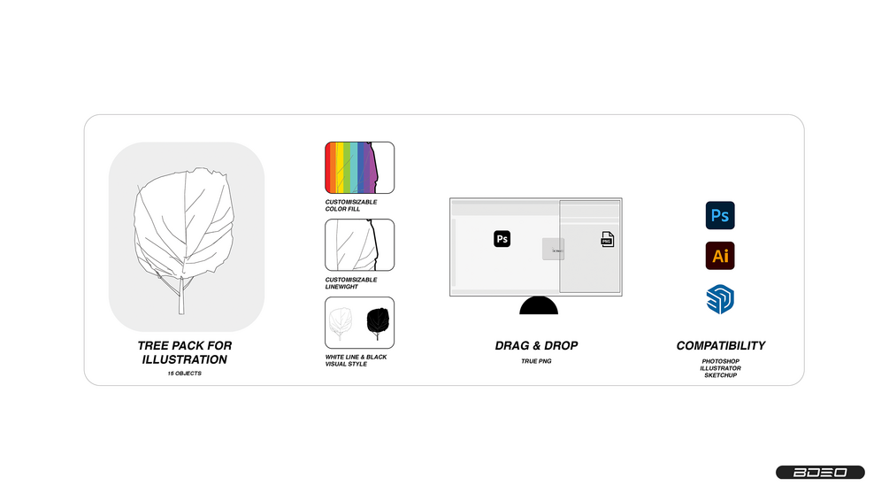 The objects have fills so it is better to insert them in your illustration, and they have also been configured with the perfect line thickness according to their size in adobe illustartor with photoshop brush of all objects to fast the workflow including 3d file (.skp) that can be used in modeling that support sketchup environment.